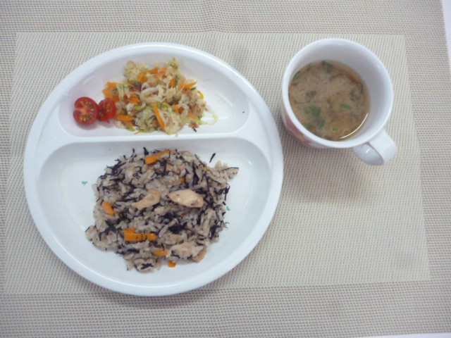 令和7年7月31日(木)の献立 2025/07/31 今日の給食は「ひじきごはん」「キャベツのおかか和え」「味噌汁」です。 おやつは「牛乳」「トマトゼリー」「ソフトせんべい」です。 キャベツのおかか和えに添えられたミニトマトは、ひかり組さんがベランダで育てたミニトマトです。 給食で提供できるくらいの大豊作だったようです♪