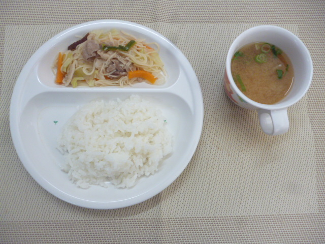 今日の給食は「ごはん」「五目ビーフン」「味噌汁」です。