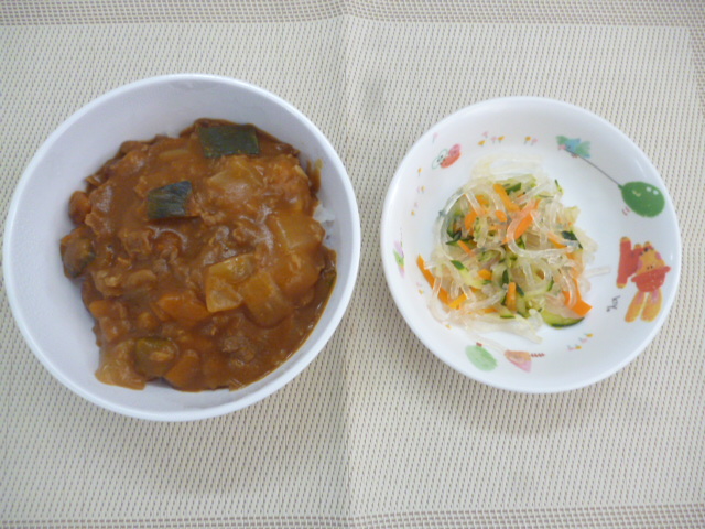 今日の給食は「ごはん」と「夏野菜カレー」と「伴三糸」