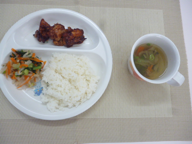 今日の給食は「ごはん」と「鶏肉のごま味噌焼き」と「チンゲン菜のお浸し」と「野菜のすまし汁」