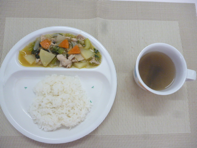 今日の給食は「ごはん」と「トンポーロー風」と「中華スープ」