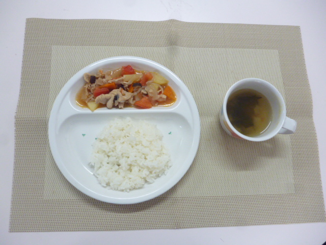 今日の給食は「ごはん」と「トマトすき焼き」と「玉葱とわかめスープ」