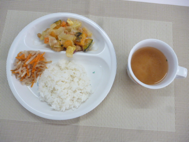 今日の給食は「ごはん」と「かき揚げ」と「もやしのナムル」と「味噌汁」