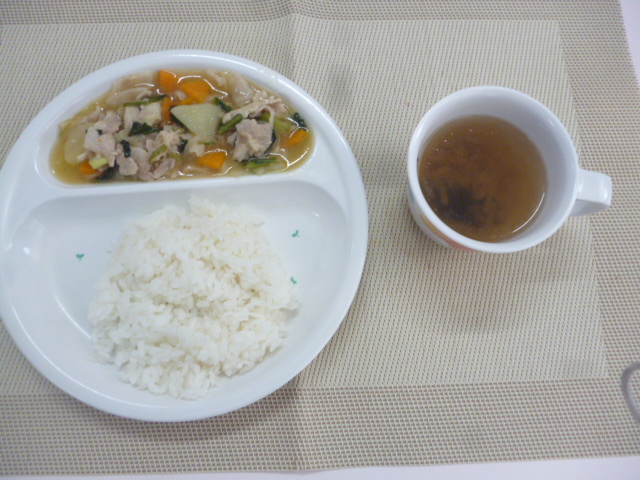 今日の給食は「ごはん」と「トンポーロー風」と「中華スープ」