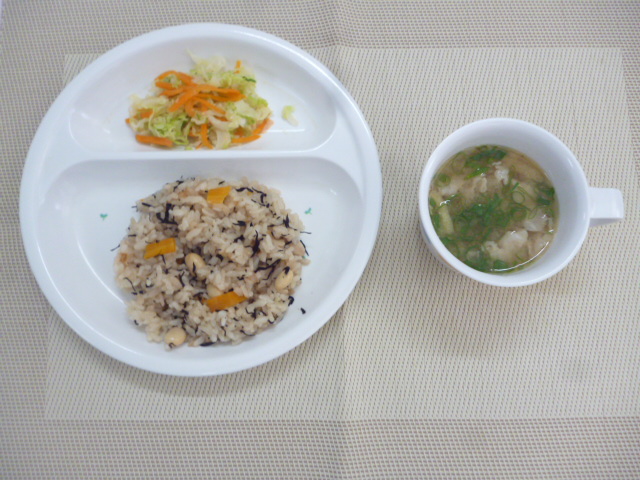 今日の給食は「大豆ごはん」と「キャベツのお浸し」と「豚汁」