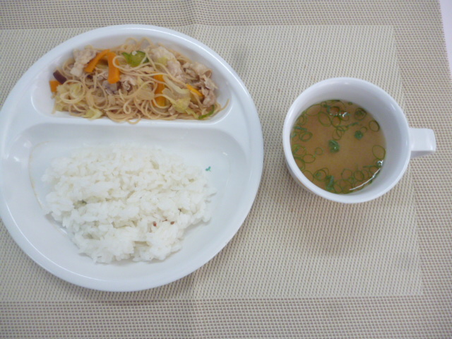 今日の給食は「ごはん」と「五目ビーフン」と「味噌汁」