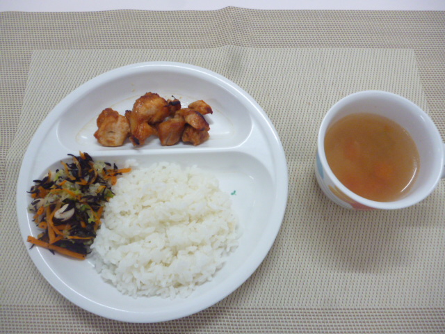 今日の給食は「ごはん」と「チキンテッカ」と「大豆とひじきのサラダ」と「夏野菜のスープ」