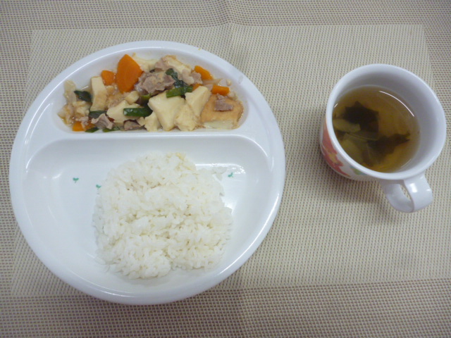 今日の給食は「ごはん」と「厚揚げチャンプル」と「わかめと玉葱のすまし汁」 おやつは「牛乳」と「はとむぎおこし」と「粉ふき芋」です。