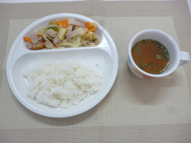 本日の給食は、「八宝菜」、「玉ネギと青ネギのスープ」と「ごはん」 おやつは、「お楽しみおやつ」と「牛乳」です。