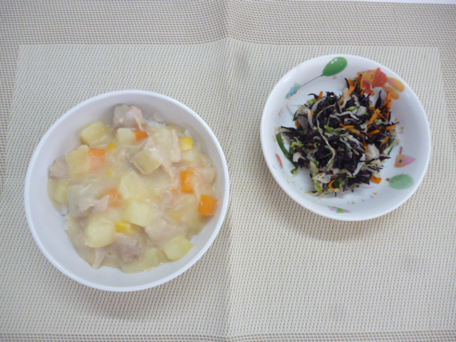 今日の給食は「ごはん」と「コーンシチュー」と「ひじきとキャベツのサラダ」 おやつは「牛乳」と「みかん缶」と「えびちび」です。