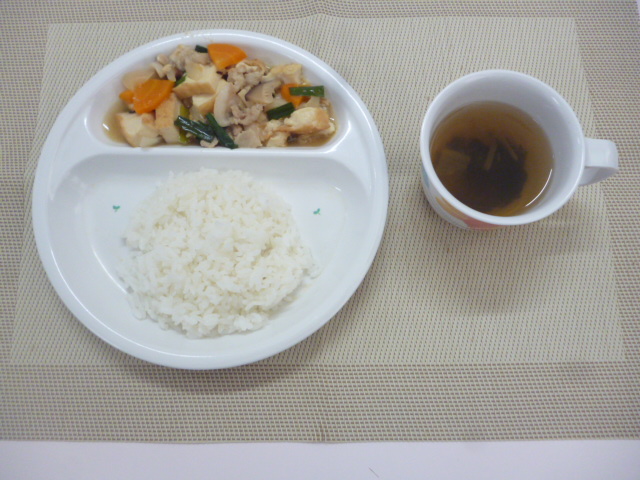 今日の給食は「ごはん」と「厚揚げチャンプル」と「わかめと玉葱のすまし汁」