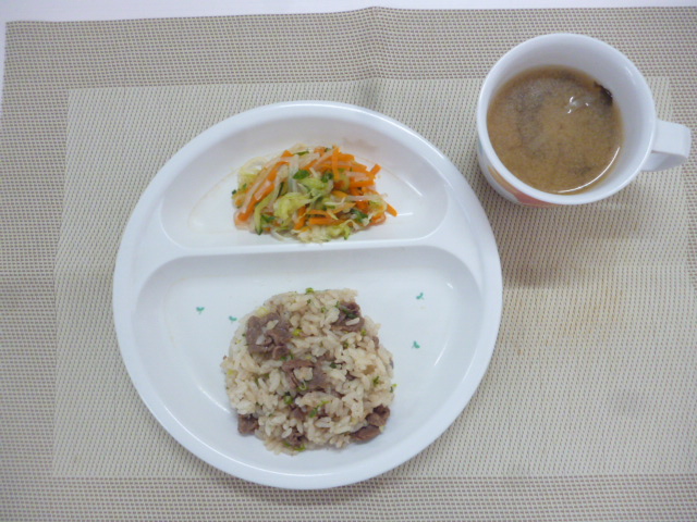 今日の給食は「牛めし」「伴三糸」「味噌汁」です。 おやつは「牛乳」「ごぼうチップス」「きなこ餅」です。