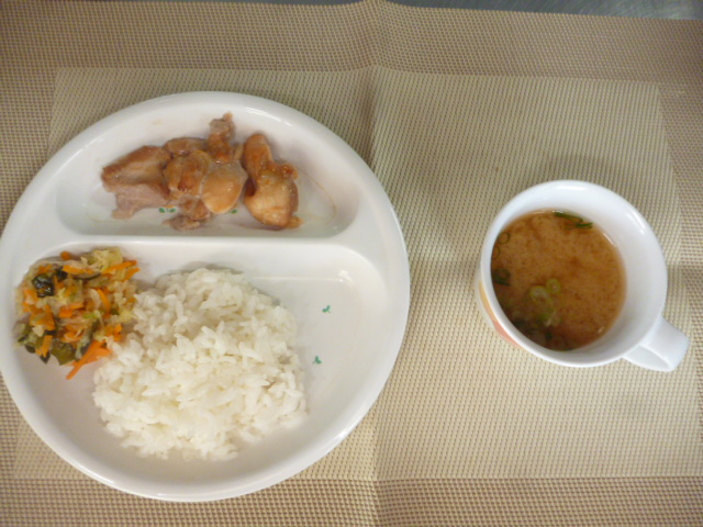 今日の給食は「ごはん」と「鳥の桑焼き」と「酢の物」と「味噌汁」 おやつは「牛乳」と「じゃこあげせん」と「きなこ豆乳寒天」です。