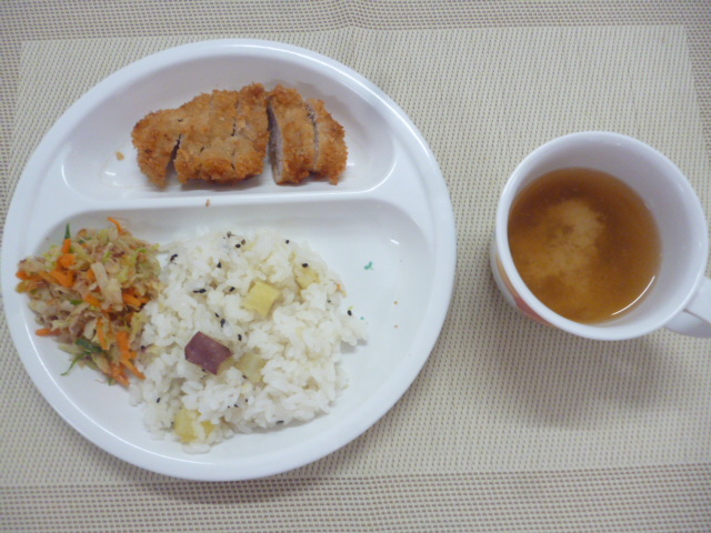 令和7年10月3日(金)の献立 2025/10/03 今日の給食は「さつまいもご飯」と「トンカツ」と「キャベツのおかか和え」と「味噌汁」 おやつは「牛乳」と「りんごジュースけーき」と「ミニぽんこざかな」です。