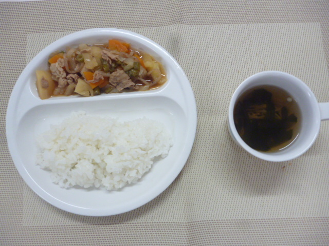 今日の給食は「ごはんと「豚肉と野菜の旨煮」と「わかめときのこのすまし汁」