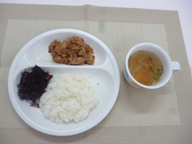 今日の給食は「ごはんと「鶏肉の味噌焼き」と「ひじきの煮付け」と「玉葱のすまし汁」」