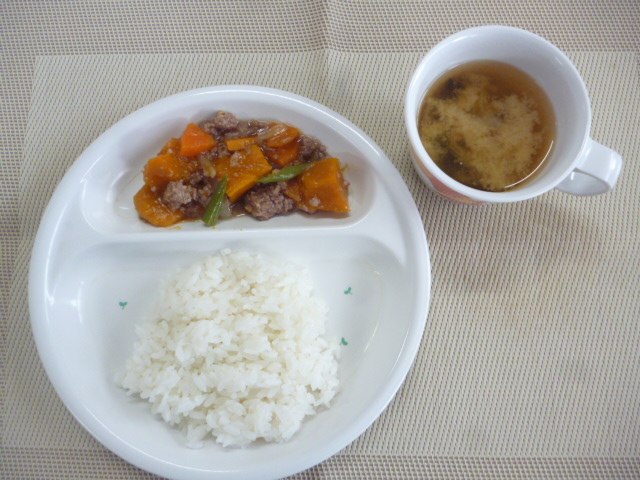 今日の給食は「ごはん」「南瓜のあんかけ」「味噌汁」です。