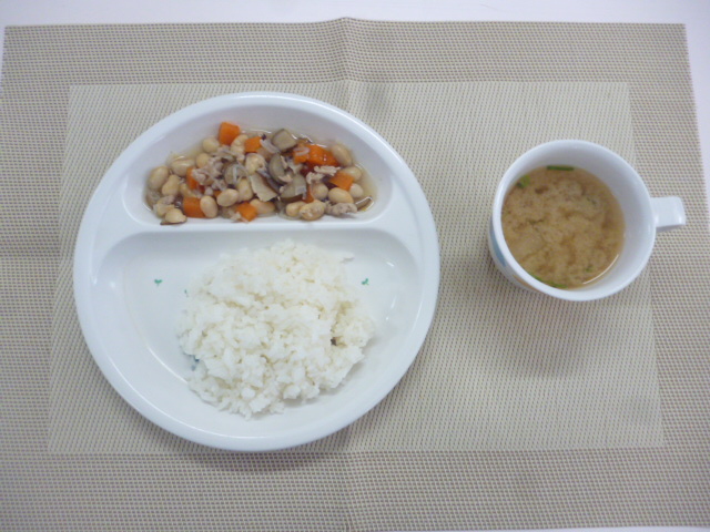 今日の給食は「ごはん」「五目大豆煮」「さつまいもの味噌汁」です。