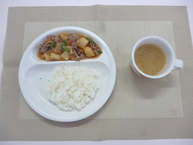 今日の給食は「ごはん」「肉じゃが」「野菜味噌汁」です。