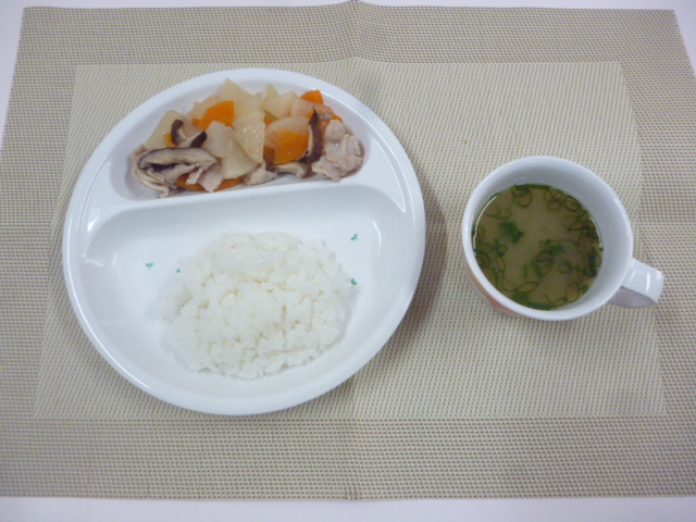 本日の給食は、「大根と豚肉の煮付」、「豆腐とわかめの味噌汁」と「ごはん」 おやつは、「お楽しみおやつ」です。
