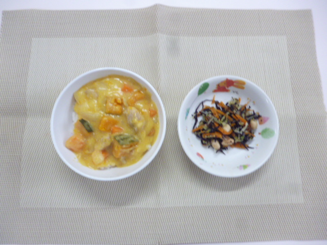 今日の給食は「ごはん」「南瓜のクリームシチュー」「大豆とひじきのサラダ」です。 おやつは「牛乳」「みかん」「いもけんぴ」です。