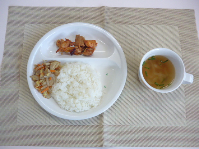 今日の給食は「ごはん」「チキンティッカ」「かみかみサラダ」「野菜のスープ」です。