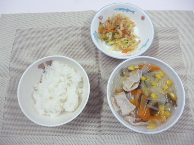 本日の給食は、「コーン春雨ラーメン」、「キャベツのおかか和え」と「ごはん」 おやつは、「お楽しみおやつ」です。