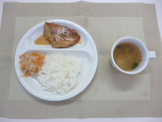 今日の給食は「ごはん」「煮魚」「もやしのお浸し」「さつまいもの味噌汁」です。 おやつは「牛乳」「五平もち」「ハッピーターン」です。