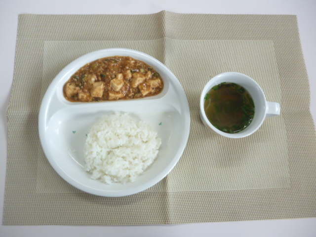 今日の給食は「ごはん」「麻婆豆腐」「春雨スープ」です。