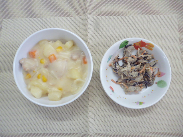 今日の給食は「ごはん」「コーンシチュー」「ごぼうサラダ」です。