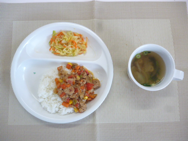 今日の給食は「ガパオ風ライス」「茹でキャベツ」「きのこスープ」です。