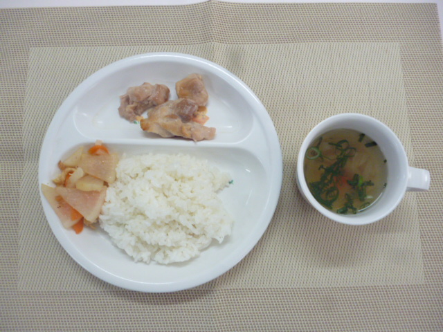 今日の給食は「ごはん」「鶏の桑焼き」「大根の炒め煮」「玉ねぎのすまし汁」です。 おやつは「牛乳」「クッキー」「ゼリー」です。