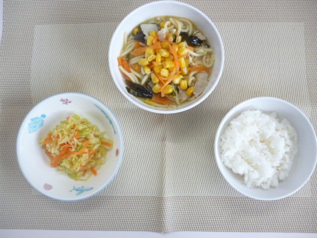 今日の給食は「ごはん」「コーンラーメン」「キャベツのおかか和え」です。