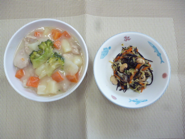 今日の給食は「ごはん」「ブロッコリーのシチュー」「大豆とひじきのサラダ」です。