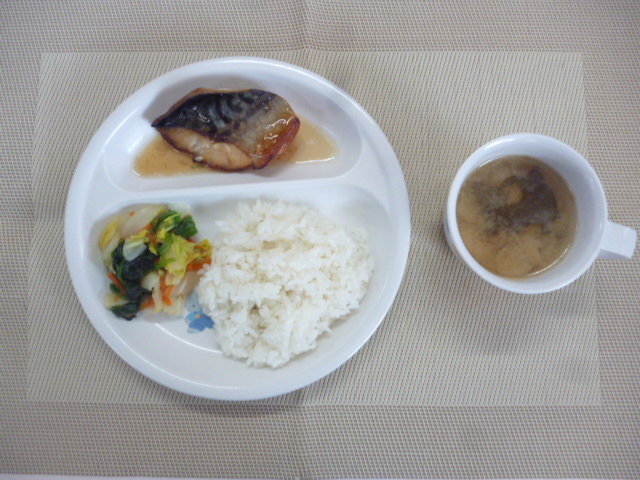 今日の給食は「ごはん」「鯖の生姜煮」「白菜のお浸し」「大根の味噌汁」です。 おやつは「牛乳」「バナナきな粉」「ミニぽん(こざかな)」です。