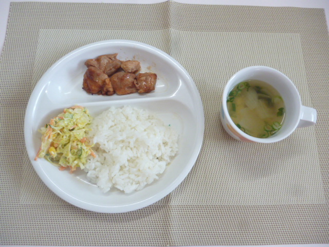 今日の給食は「鶏肉のBBQソース焼き」「コールスローサラダ」「豆腐と玉ねぎのスープ」です。