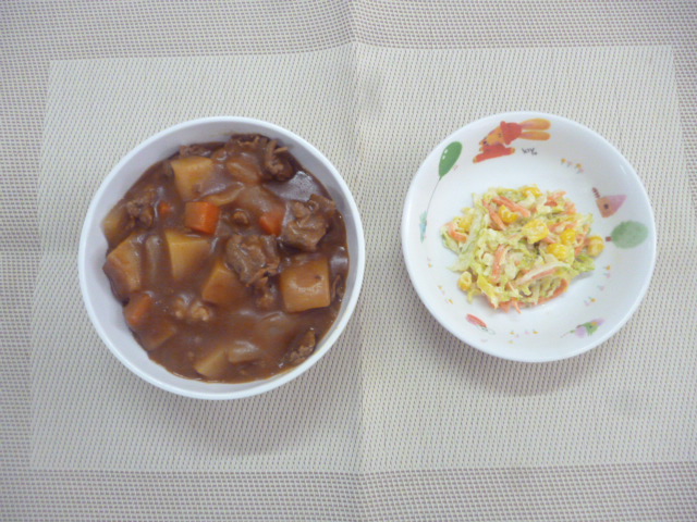 今日の給食は「ごはん」「カレー」「フレンチサラダ」です。 おやつは「牛乳」「オレンジ」「ぱりんこ のり塩味」です。