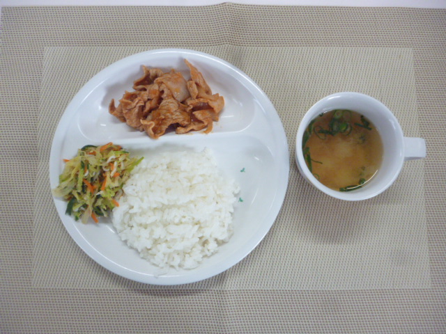 今日の給食は「ごはん」「豚肉のノルウェー風」「ごま和え」「味噌汁」です。 おやつは「牛乳」「新潟仕込み」「りんご」です。