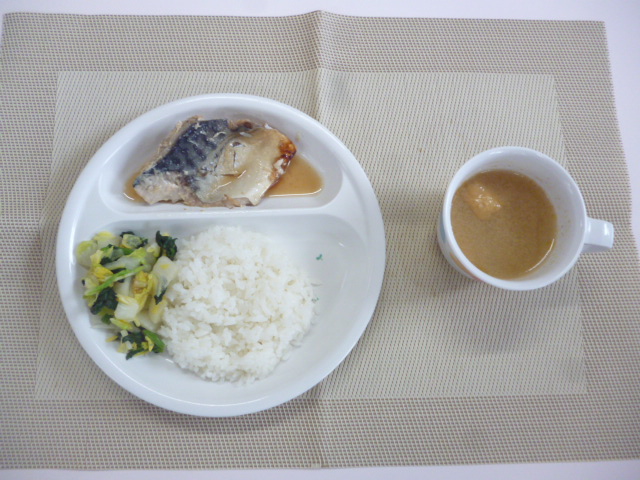 今日の給食は「ごはん」「鯖の生姜煮」「白菜のお浸し」「大根の味噌汁」です。 おやつは「牛乳」「バナナきな粉」「ミニぽん こざかな」です。