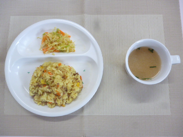 今日の給食は「カレーピラフ」「茹でキャベツ」「味噌汁」です。