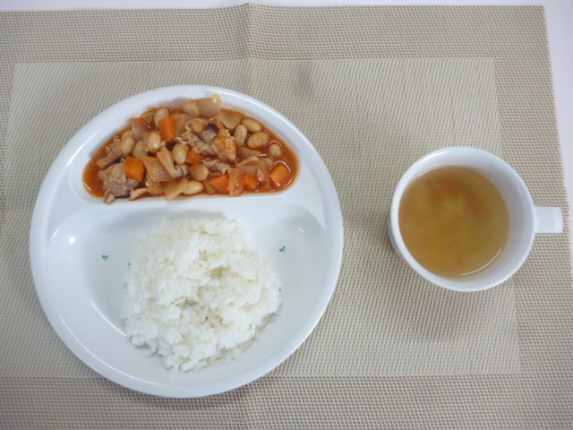 今日の給食は「ごはん」「ポークビーンズ」「野菜スープ」です。 おやつは「牛乳」「はとむぎおこし」「粉ふき芋(青のり)」です。