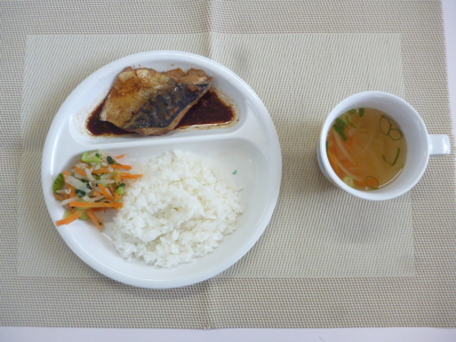 今日の給食は「ごはん」「鯖の味噌煮」「チンゲン菜のお浸し」「玉ねぎのすまし汁」です。