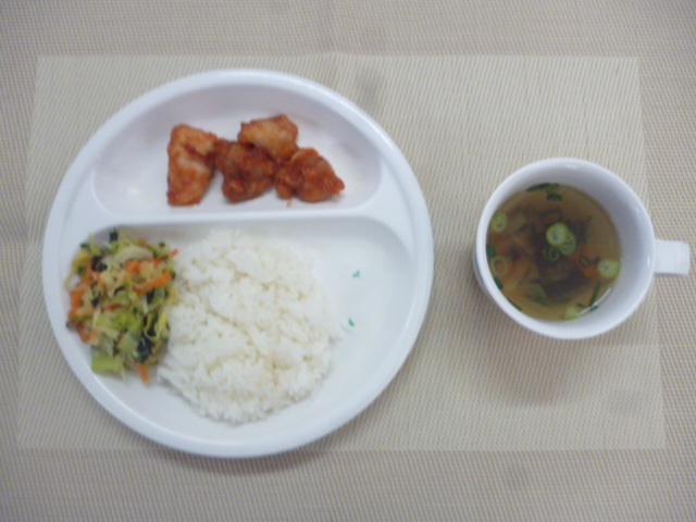 今日の給食は「ごはん」「鶏肉のケチャップ和え」「和風サラダ」「春雨のすまし汁」です。 おやつは「牛乳」「あじわいプリン」「星たべよ」です。