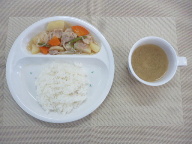今日の給食は「ごはん」「豚肉と野菜の旨煮」「味噌汁」です。 おやつは「お楽しみおやつ」です。