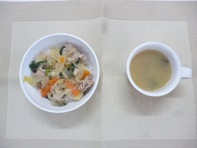 今日の給食は「スタミナごはん」「味噌汁」です。 おやつは「お楽しみおやつ」です。