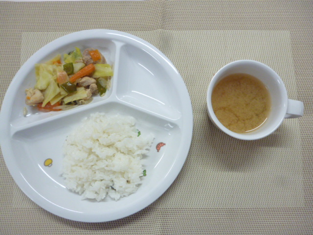 今日の給食は「ごはん」「鶏肉の野菜炒め」「味噌汁」です。 おやつは「牛乳」「豆乳あべかわ」「元気あまからせん」です。