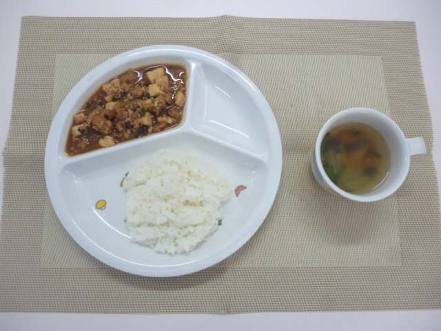 今日の給食は「ごはん」「麻婆豆腐」「春雨スープ」です。 おやつは「粉ふき芋」「はとむぎおこし」「牛乳」です。