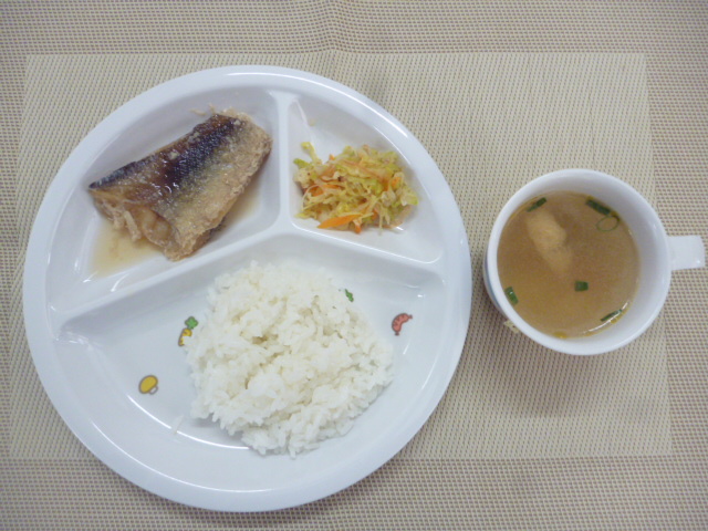 今日の給食は「ごはん」「煮魚」「キャベツのおかか和え」「揚げと野菜のすまし汁」です。