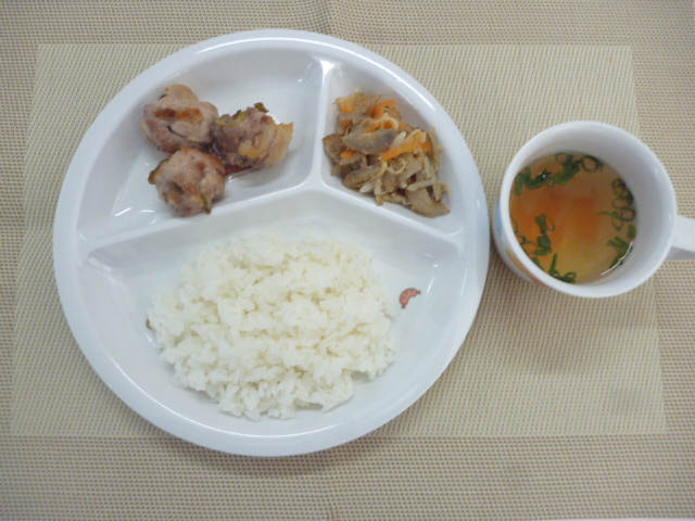 令和8年4月17日(金)の献立 2026/04/17 今日の給食は「ごはん」「豚肉の南蛮漬け」「かみかみサラダ」「玉ねぎのすまし汁」です。 おやつは「牛乳」「米粉のカップケーキ(イチゴ)」「ハッピーターン」です。