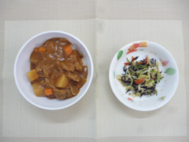 今日の給食は「ごはん」「カレー」「まっくろくろすけサラダ」です。 おやつは「牛乳」「オレンジ」「ソフトサラダ」です。
